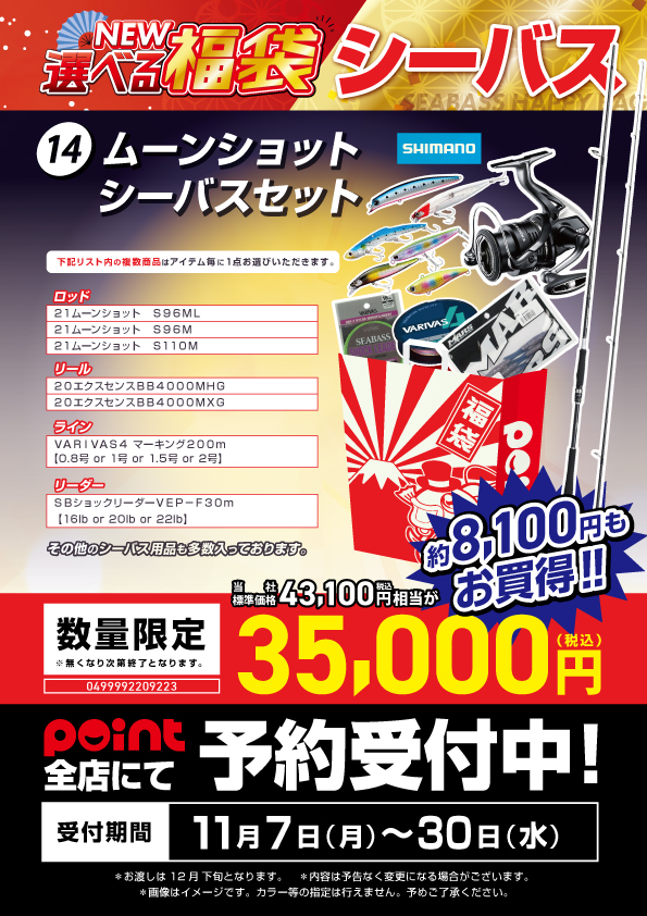 みなさん、こんにちは!! 福袋紹介第14弾!! シーバス釣りやってみたい方必見です!! ムーンショットシーバスセット です!! スタッフイッシーオススメです!!...