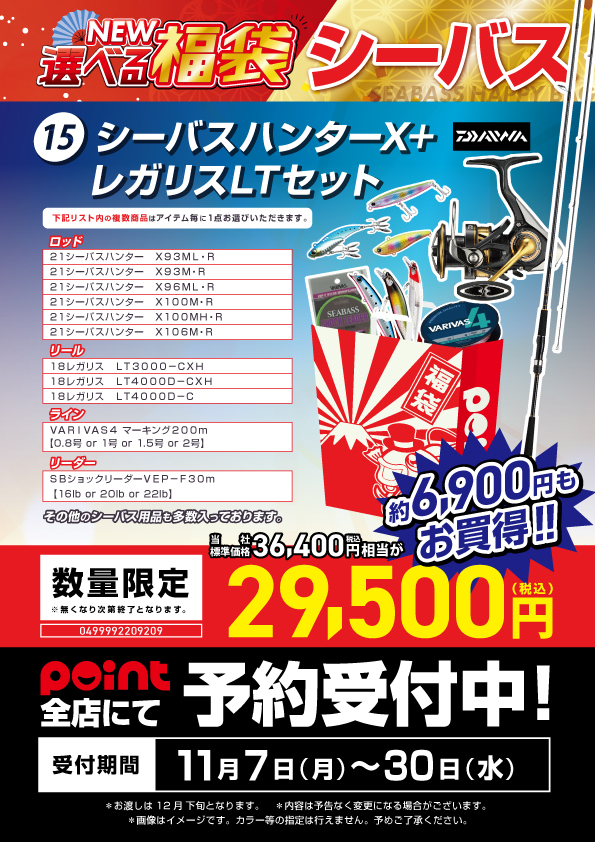 みなさん、こんにちは!! 福袋紹介第15弾!! エサ釣りは飽きた!そんな方にオススメです!! シーバスハンターX+レガリスLTセット です!! スタッフ西山オススメです!! 「...