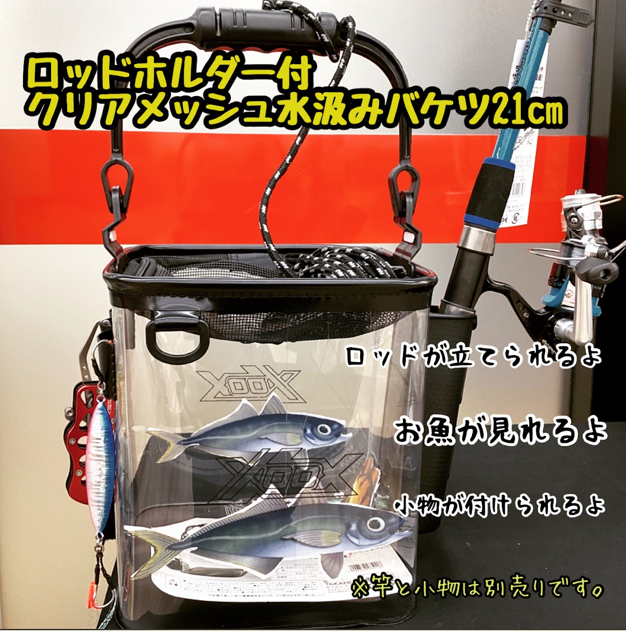 こんにちは 大人気 ロッドホルダー付 クリアメッシュ水汲みバケツ21cmのご紹介です 便利なロッドホルダー付で 小物などもぶら下げられます ...