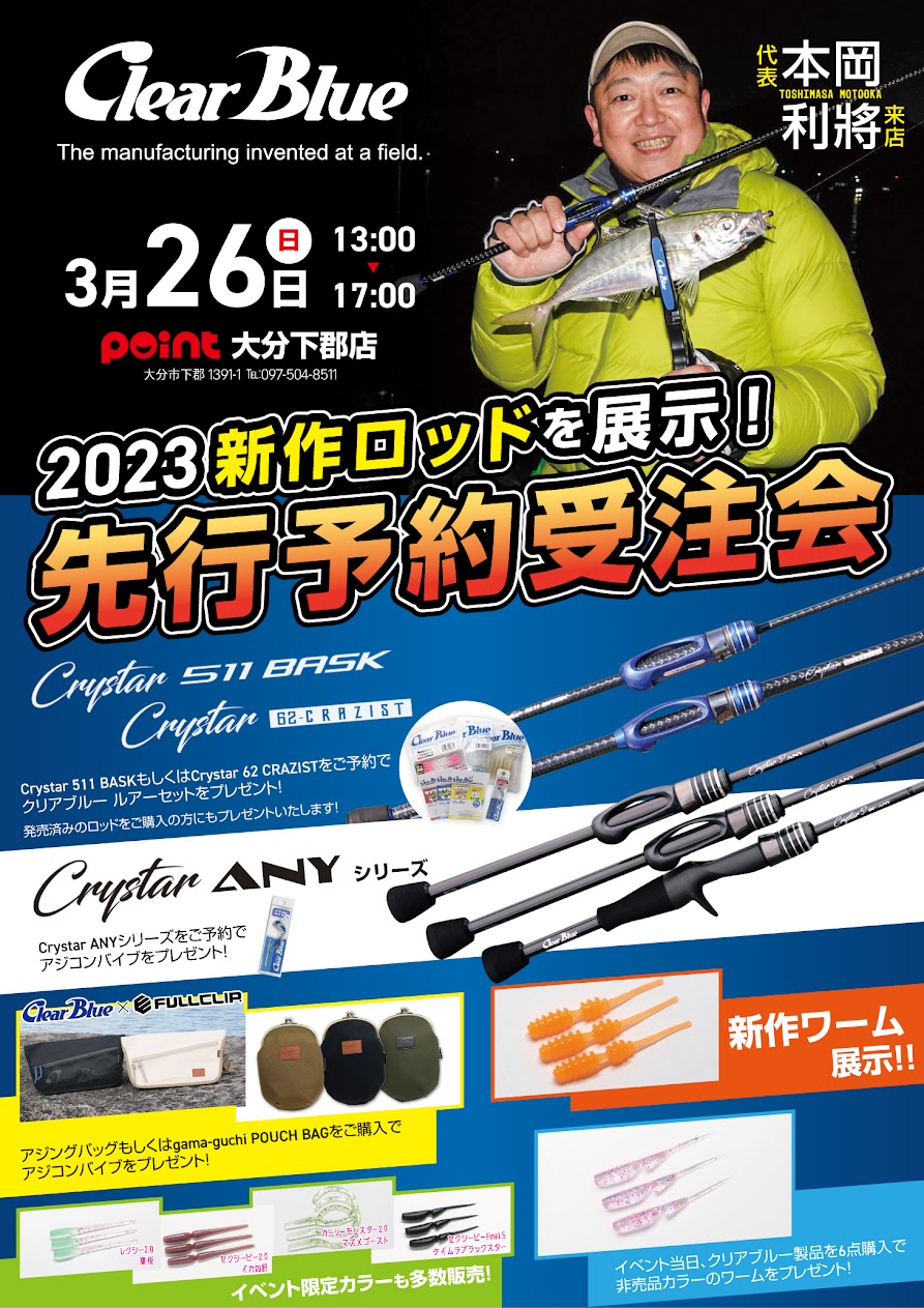 こんにちは いよいよ本日‼ 13:0017:00まで 大人気‼アジングメーカー「クリアブルー」 先行予約受注会を開催致します 新作ロッド ・...