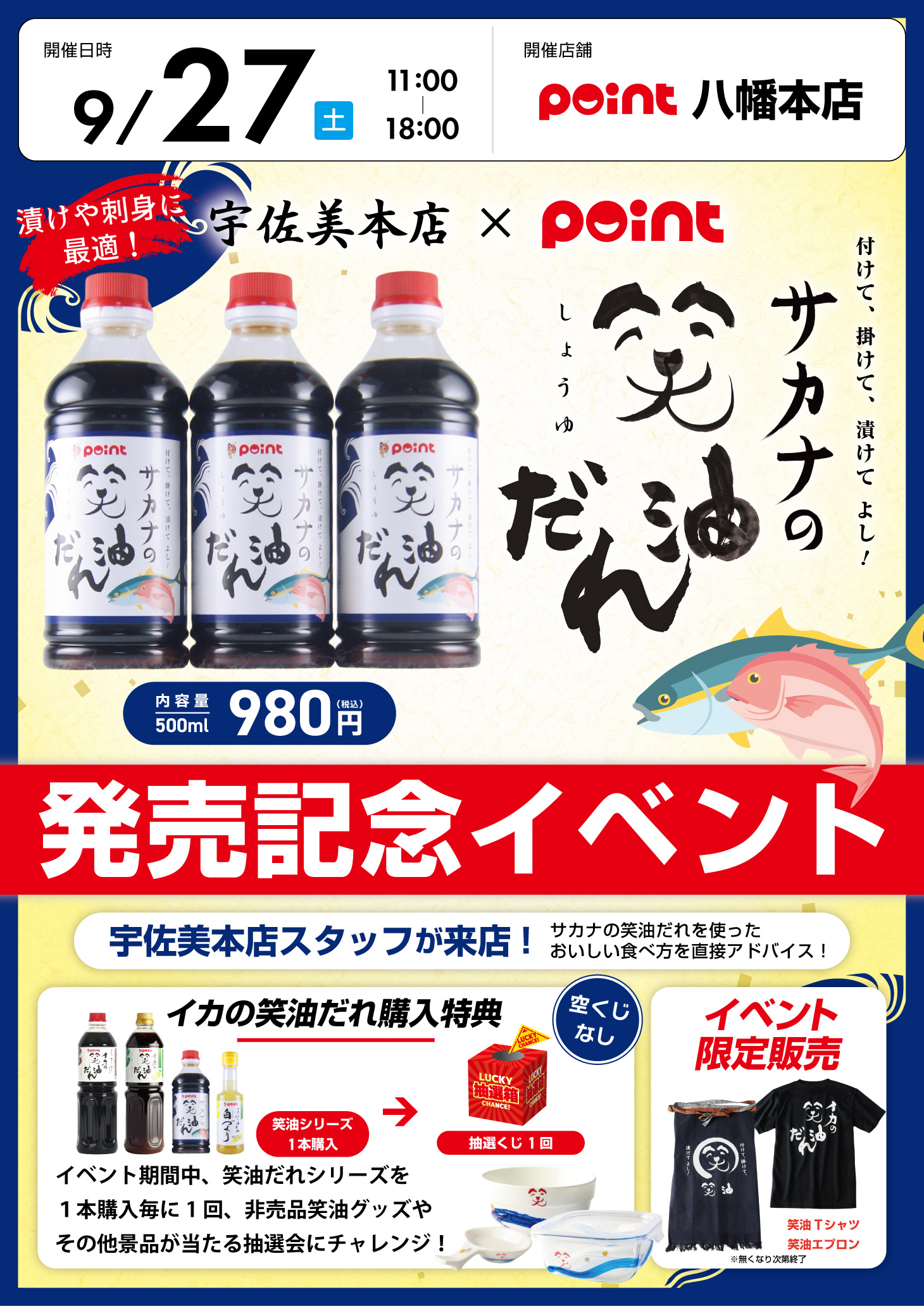 皆さんこんにちは! ポイント小倉湯川店です!!! 本日、ポイント八幡本店にて サカナの笑油だれ発売記念イベント開催! 本日は抽選会やイベント限定販売なども ご準備しております!...