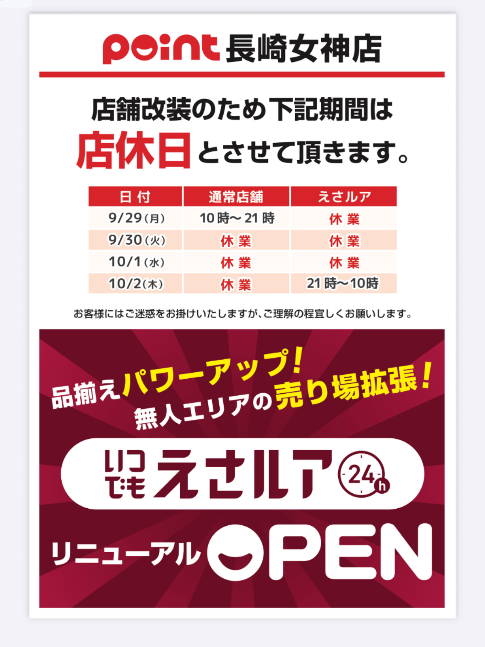 長崎女神店の店舗改装と リニューアルセールのご案内です! 改装に伴いまして、店休日を設けさせて頂きます。 10月3日(金)より通常営業時間にて 営業致しますが、 10月7日(火)10月26日(日...