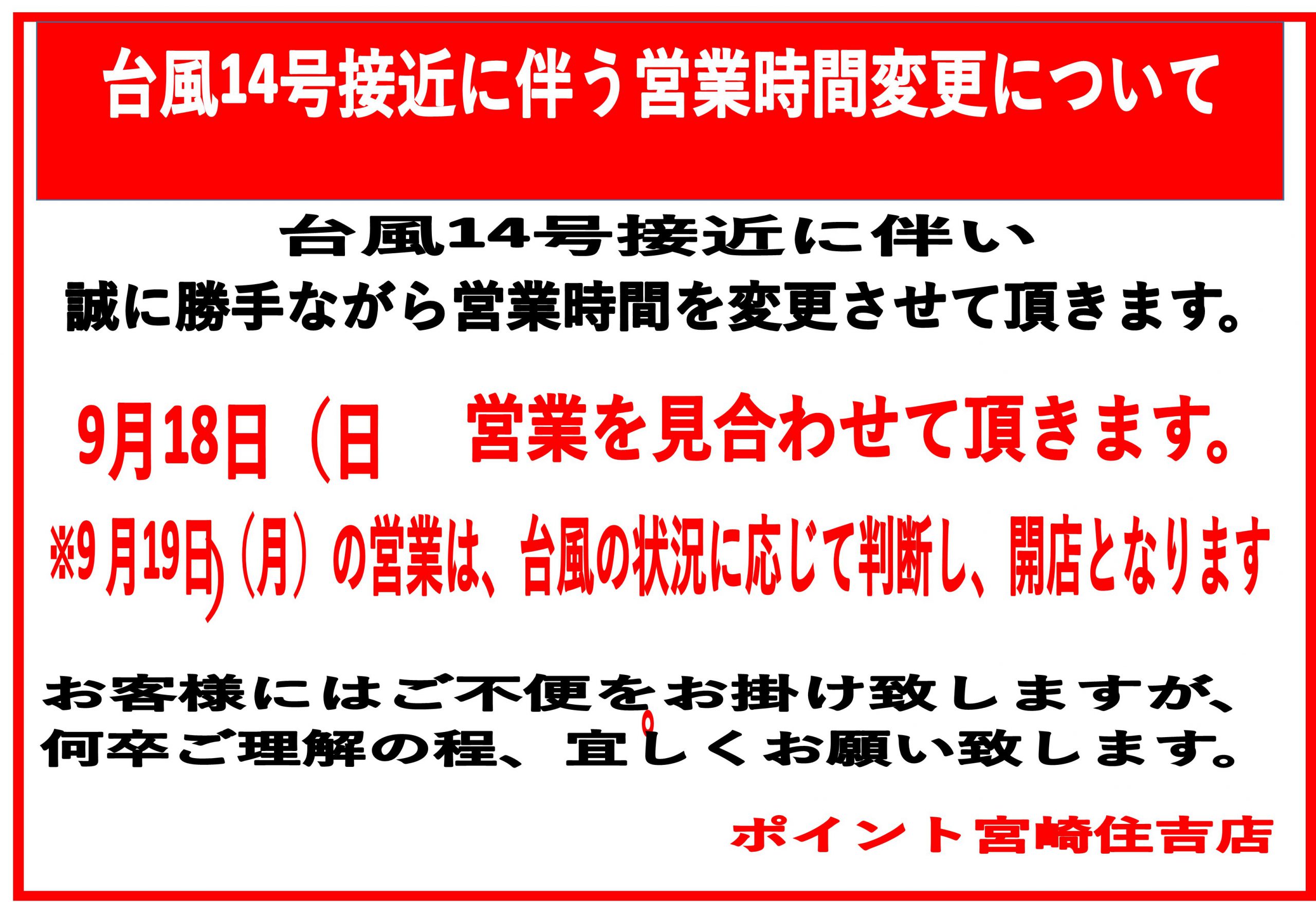 ポイント宮崎住吉店です。 台風14号接近に伴い営業時間の変更がございます。 本日9月18日(日)は営業を見合わせて頂きます。 何卒ご了承の程、宜しくお願い致します。 また、...