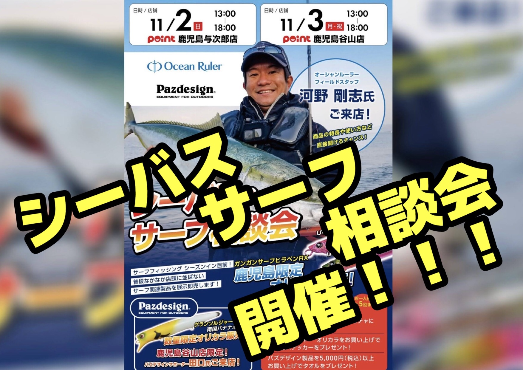 皆さんこんにちは ポイント与次郎店です!! 来る 11月2日!! なんと オーシャンルーラー パズデザイン シーバス・サーフ相談会 開催致します!!!...