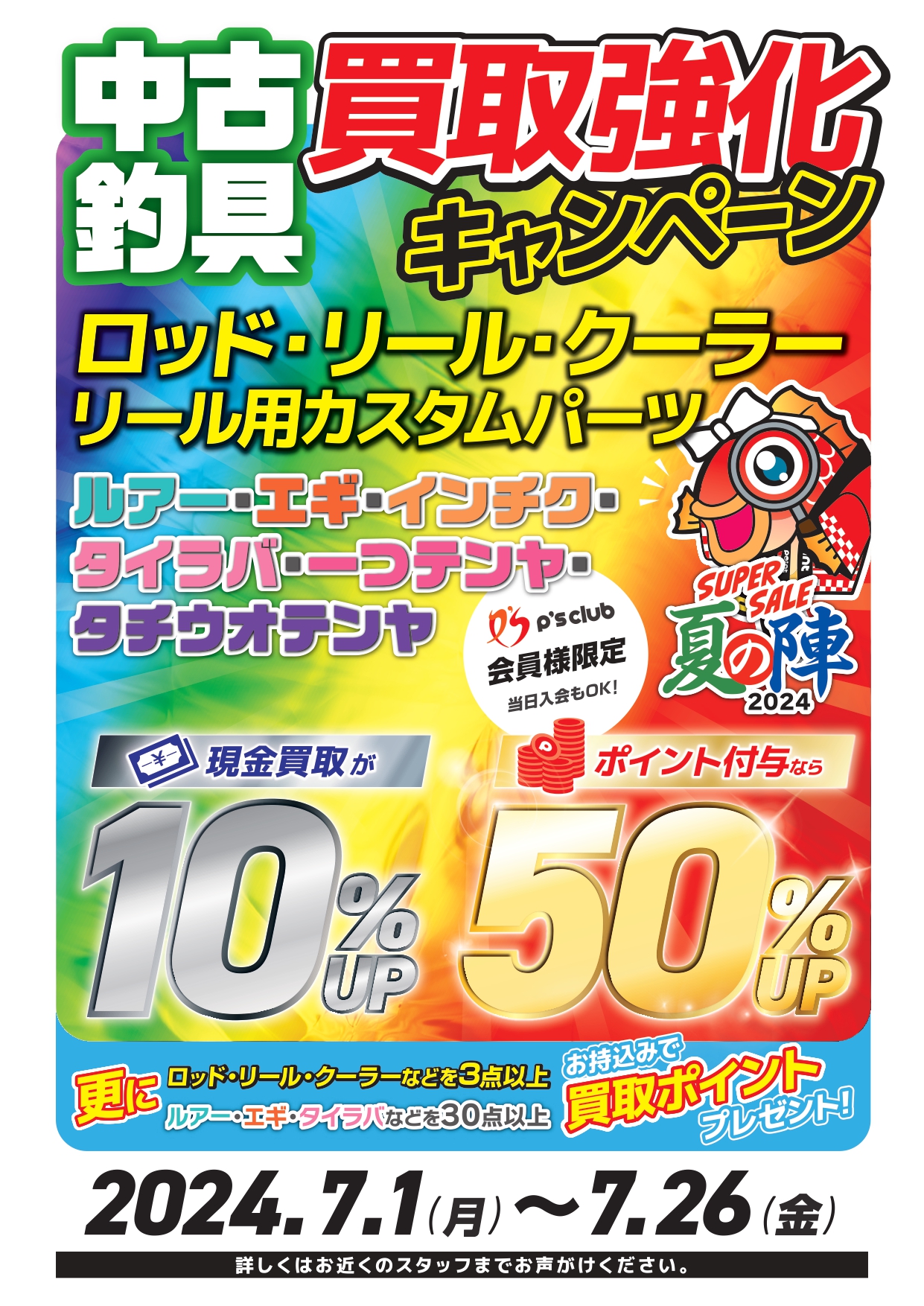 みなさま、こんにちは ただいま中古買取強化キャンペーン中 ただいま釣具のポイントでは 2つのお得な中古釣具買取キャンペーンを 開催いたしておりますヾ()ノ 期間は7/1(月)7/26(金)...