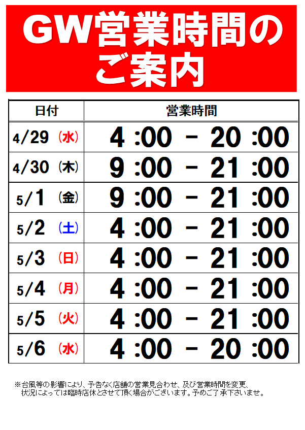 GW期間中の営業時間のご案内です!